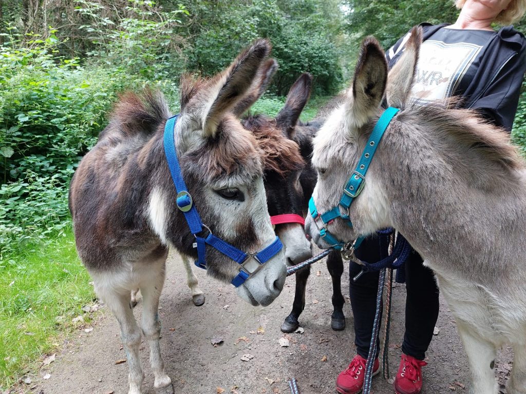Wir müssen aufpassen, dass die Esel unterwegs nicht fressen. Bitte bringen Sie auch keine Leckereien für die Esel mit. Die Esel werden nicht geritten.